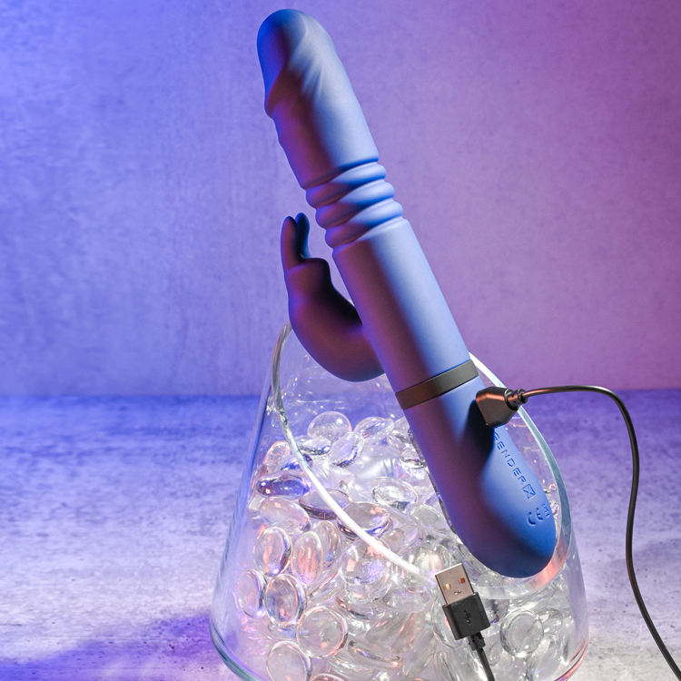 This tall, smooth rabbit vibe is ready to thrust all night! With a supple, textured tip and an accordion center that stretches in and out, you’ll be amazed at the look and feel of the powerful thrust function. But this large fully submersible shape has a few more secrets up its sleeve – a powerful rabbit shaft whose bunny ears just won’t quit, and rotating beads in the shaft that churn and spin with an erotic rhythm perfect for any massage! Between the thrusting, rotating and powerful vibrations, you’ll be headed for a mind-melting experience in no time, especially with the ergonomic controls that let you customize as you go. Fully rechargeable and easy to clean!