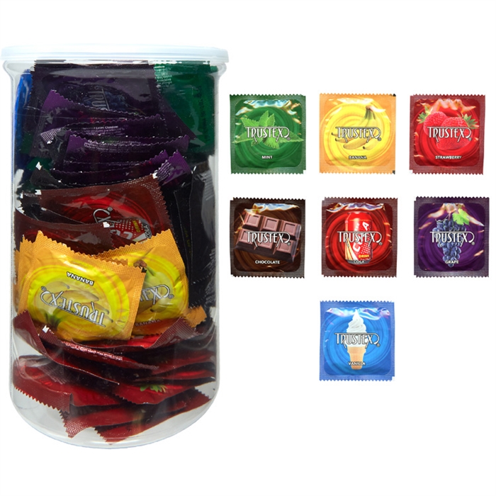 Jar of 100 latex condoms with various flavors. These latex condoms are strong and durable with a reservoir tip and lubrication for comfort during sex. The best part however is the delicious flavor on the outside for sweet oral satisfaction! This flavored condoms is the perfect accompaniment to spontaneous encounters with your partner adding an extra tasty twist to oral sex. The trustex flavored condoms allow you to spice things up while still protecting. Size: 190mm in lenth and 52mm in width.