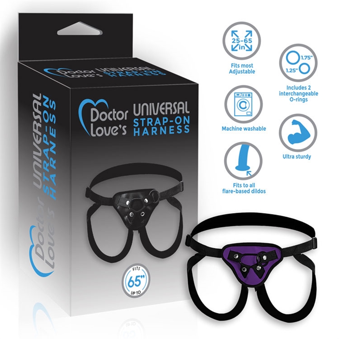 Doctor Love's Universal Strap-On Harness is an exceptional accessory for those who are looking to explore their sexual desires. The harness is designed to fit most body types, adjustable between 25-to-65-inch waists, and offers extra support with its full-back style. It comes with two interchangeable O-rings, measuring 1.25 and 1.75 inches, allowing you to attach different sized flare-based dildos. The harness is made from body-safe, phthalate-free materials that are also machine washable, ensuring that it can be used repeatedly without any concerns. Additionally, the soft and comfortable padding on the harness ensures a snug and comfortable fit for the user. With its sturdiness, adjustability, and versatility, Doctor Love's Universal Strap-On Harness is a must-have for those looking to add some excitement to their sexual experiences.