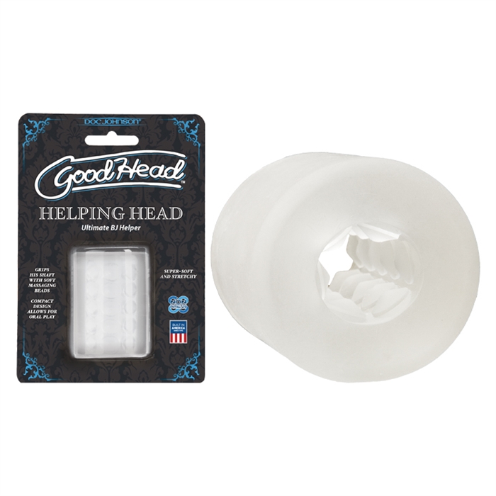 Doc Johnson's new GoodHead Helping Head is a revolutionary 2” mini stroker specifically designed for handheld use to heighten the sensations and pleasure during fellatio. Soft on the outside, and with stimulating massage beads on the inside, this stretchy stroker is made from our clear ultra-realistic UR3 material, for the most lifelike experience in the world. Turn GoodHead into great head tonight!