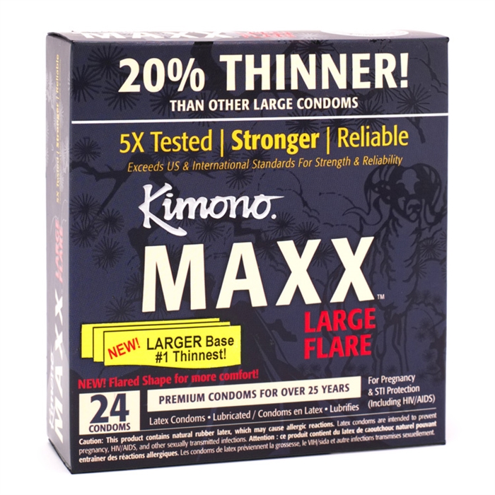 You asked for it, and we listened. Kimono MAXX condoms can help provide a better love making experience through features such as: 25% more extra head room, added length and extreme thinness. To make the best MAXX condom, we've added extra room where it matters the most: the head of the penis. A relaxed fit at the head eliminates that constricting feeling that some people dislike. We've increased the length of the condom to provide coverage for a longer penis. We've retained a secure large flare fitting base to prevent slipping or leaking. Finally, we've made our Maxx condom 20% thinner to allow more feeling.