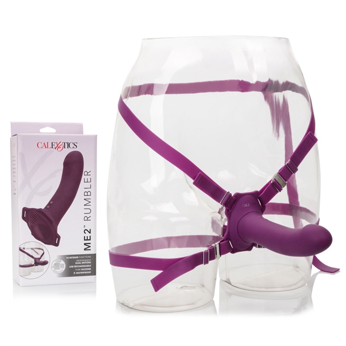 The ME2™ Rumbler probe is a vibrating contoured strap on vibrating massager here to thrust you into a world of mutually assured satisfaction. The curved shaft, tickler base and 2 powerful vibration motors located in the shaft and the base create a pleasure paradise for two with every use. Feel the heat rise while the vibrating massager ticklers tease you with 10 independent functions of vibration, while the pliable shaft and curved g-spot massager tip delivers intense stimulation for her. The versatile shape and dual motor design make for indulgent and creative pleasure play. The versatile vibrator shape and contoured base allows you to slip this probe into your favorite harness for hands free play. Use the easy touch button control to flicker through 10 intense functions of vibration, escalation and pulsation. Recharge the premium silicone massager in 2 hours with the provided USB charging cable to enjoy 1.5 hours of high-speed stimulation or 2 hours of low speed vibrations. The thick, durable silicone straps are fully adjustable, can be removed and fit up to a 52” Waist (132 cm) with plenty of extra stretch. While the easy button controls the intensity and the plump probe gives you the stimulation you want, the integrated state of the art memory chip remembers just how you like it by starting on the last function used. The self-sealing charging port and virtually seamless body let you get steamy in and out of water with this waterproof probe. The hypoallergenic premium silicone is body safe, unscented and phthalate free to keep you most sensitive spots, happy and healthy.