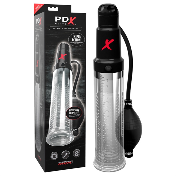 Experience 2 ways to intensify your erection with 1 genius stoker! The PDX ELITE Suck-N-Pump Stroker features a medical-style pump ball that functions as an erection pump in one position and as a masturbation stroker in a second position – double the performance options of an ordinary pump!