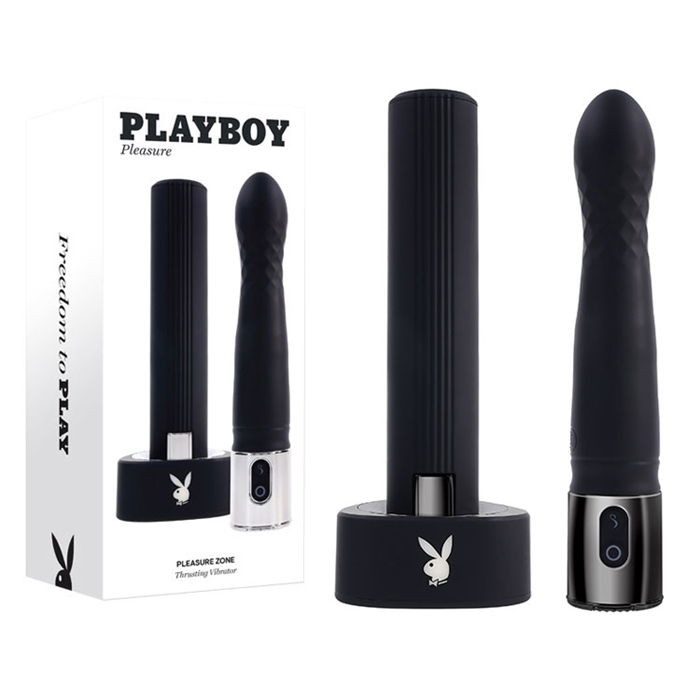 Welcome to the Pleasure Zone where intense vibrations meet powerful thrusting to deliver a deeply orgasmic experience. Enjoy the tickle of the diamond-pattern textures on the tapered 10-speed head, then engage thrusting for a wild ride that will leave you breathless. Despite its impressive size, this robust toy is also quite stealth, slipping into its stylish protective case and onto the charging base that features a light-up Playboy rabbit head as its indicator light.