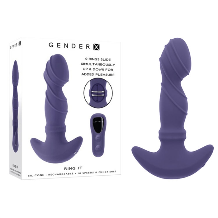 This deeply-textured rigid vibe features a prominent angled head and two sliding rings at its base that glide up and down in multiple speeds. The robust motors in the shaft can be operated separately either directly on the toy’s wide safety base or with the ergonomic long-range remote control.