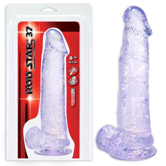 Rod Star® 37, flexible, soft, durable and offering years of happiness and smooth running. Phthalate free, latex free and odorless, thus skin-friendly. Make sure you have an authentic Rod Star® product; for quality, reliability, security, comfort and your total satisfaction. It has a total length of 8’’ (20.3 cm), a diameter of 1.6’’ (4 cm) and a suction cup at its base. A translucent clear model, this one is more of the slender style.