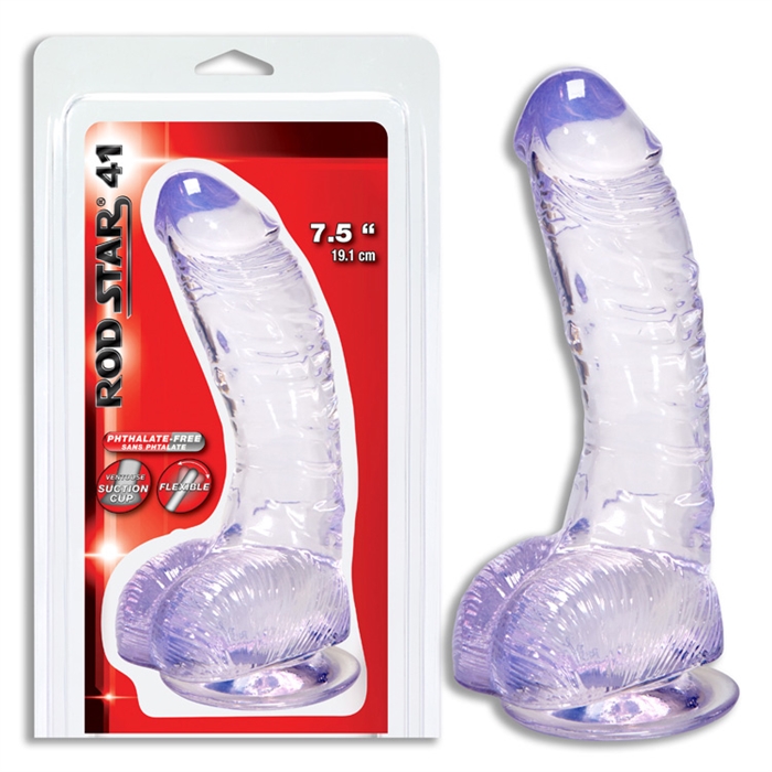 Rod Star® 41, flexible, soft, durable and offering years of happiness and smooth running. Phthalate free, latex free and odorless, thus skin-friendly. Make sure you have an authentic Rod Star® product; for quality, reliability, security, comfort and your total satisfaction. It has a total length of 7.5" (19cm), a diameter of 1.6’’ (4 cm) and a suction cup at its base. A translucent clear model, curved for more sentations with balls.