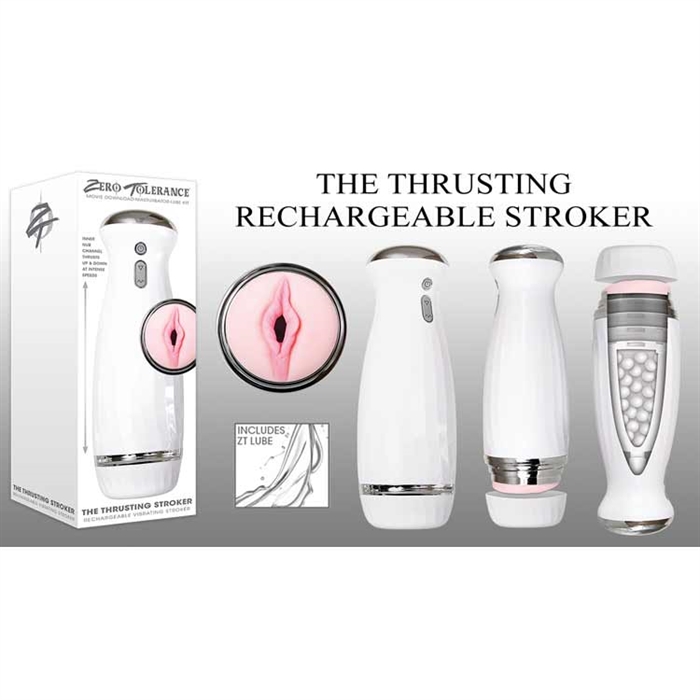 Zero Tolerance Toy is proud to unveil this powerful thrusting stroker that feels just like the real thing because its motor seems to have a mind of its own! The life-like vaginal entry gives way to erotic, soft and stretchy pleasure nubs that massage and tickle as you slip inside. Then choose from five different thrusting speeds with five different intensities each, that literally stroke up and down with the power of European motor technology. Kick start your fantasy with a free adult movie download and use plenty of lubricant for best results. The entire stroker assembly comes apart end clean-up is easy with Zero Tolerance Masturbator Cleaner and a warm water rinse.