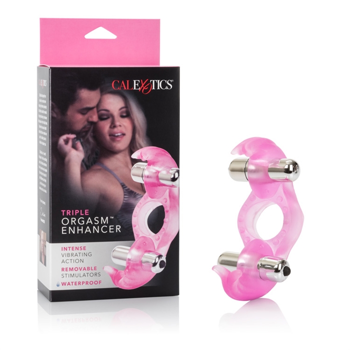 Elevate and extended your intimate enjoyment with the Triple Orgasm Erection Enhancer. The soft and stretchy ring provides comfortable stamina and support for a rock hard performance that goes on and on. The enhancer also boasts triple contact stimulation and includes power-packed dual multi-speed vibrating bullets. The exotic enhancer measures 4.5”x 2”/11 cm x 5 cm and is made from ultra soft and stretchy, unscented phthalate free TPE. The curved and contoured ring is studded with pleasure nubs and features a flickering clitoral teaser and a testicular arouser that simultaneously delivers intensely pleasurable thrills for him and her. The enhancer includes with two wireless silver-plated ABS, stimulators that slip into the sleeve for intensified vibration sensations. The easy to use ring provides optimal stamina support for premium erection maintenance and a rock hard performance. The comfortable to wear ring is suitable for first-time and experienced users, and ideal for spontaneous seduction and extended foreplay fun. The removable, vibrating mini bullet stimulators can also be used to arouse and stimulate erogenous zones and super sensitive sweet spots all over the body, for the ultimate sensuous encounter. - See more at: http://calexotics.com/triple-orgasm-erection-enhancer-pink.html#sthash.2KSSER5r.dpuf